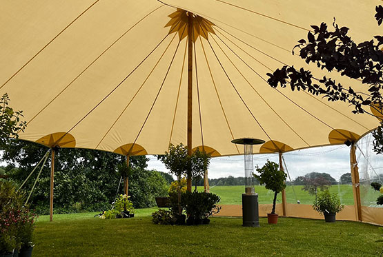 Onze sailcloth tenten ademen elegantie. Met hun luchtige, lichtdoorlatende doek en stijlvolle houten palen creëren ze een verfijnde setting die jouw bruiloft of evenement een magische uitstraling geeft.
